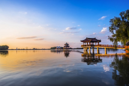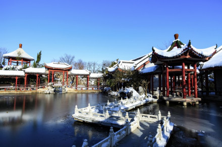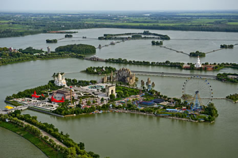 五冠橋位于旅游區(qū)主景觀帶的環(huán)湖路景觀帶上,它是根據(jù)揚州瘦西湖五亭橋所建,因橋上建有五個亭子,便被稱為“五亭橋”。景區(qū)內的五亭橋把五個亭子改成了形狀如冠的形狀,其余均同五亭橋,所以又名“五冠橋”。