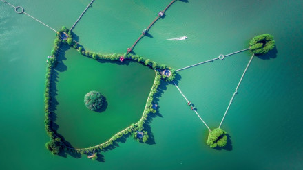 八里河懸空水上觀光玻璃天橋,全長425米,寬3米,全高55米,采用全透明特種玻璃建造,像一條蜿蜒的飛龍盤旋在八里河水面之上。將9D聲光電碎彩屏、花鳥游魚立體特效等流行科技元素與橋面結合震動,同時還有音效。 |