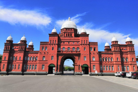 天下第一門是八里河旅游區(qū)的主園區(qū)大門。它綜合了俄、英、美三國的建筑特點,造就了具有八里河藝術風格的建筑,也是景區(qū)的標志性建筑。這個樓堡式大門共有13個白色圓頂,中間一個較為突出,外墻飾有猩紅色的噴砂。