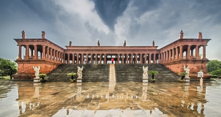 宙斯神廟原型位于希臘奧林匹亞村奧林匹亞山上,是為了祭祀宙斯而建,它是古希臘最大的神廟之一。八里河旅游區(qū)的宙斯神廟是依照復原的模型建造的,整座建筑鳥瞰成U型,上面覆蓋著錯層框架式屋頂。
