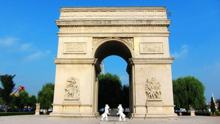 凱旋門是為了紀念拿破侖一世在1805年12月2日的一次戰(zhàn)役中大敗奧俄聯(lián)軍的勝利而建的。在1806年2月12日,根據(jù)拿破侖一世親自批準的計劃,按照著名設計師戛爾格蘭的設計圖紙施工,歷時30年,于1836年7月29日竣工。八里河風景區(qū)的雄獅凱旋門是按原建筑的1/3縮小。