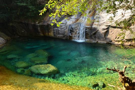 彩池隨周圍景色變幻、太陽角度及光線明暗的不同,或晶明或翠綠,變化萬千,絢麗多彩,宛如一顆顆翡翠灑滿谷中,故名翡翠谷。 在獲奧斯卡四項大獎的影片《臥虎藏龍》中,竹稍打斗、池邊愛戀、飛瀑踏波等鏡頭都拍攝于翡翠谷。