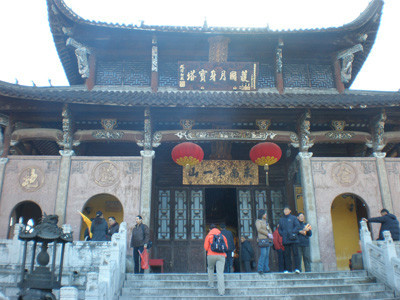 真身寶殿,俗稱“肉身殿”,又稱“肉身塔”,坐落在九華山神光嶺(老爺頂)上,為佛教徒朝謁九華圣地的主要場院所,這里因主供地藏菩薩,故與一般佛寺不同。九華山肉身殿是典型的宮殿建筑,殿高15米,門朝西南。入殿須登八十一級臺階,站在臺階之下,舉目仰望,可見南門廳上兩塊匾額:上額書“肉身寶殿”,下額書“東南第一山”。大殿四周回廊上方雕梁畫棟,仙鶴、麋鹿等珍禽異獸,牡丹、靈芝諸鮮花奇草。