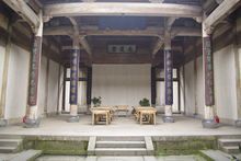 前廳是整幢房子中最精華的部分,大門后面聳立著一幅威儀的中門,在中門“!弊值纳戏,鑲有一幅木雕“百子鬧元宵”圖,圖上雕刻著100個(gè)小男孩過(guò)元宵鬧花燈時(shí)的情景,這正是古代“多子多!眰鹘y(tǒng)觀念的生動(dòng)寫照,“百子鬧元宵”圖兩邊的“商”字斗拱上則分別雕有四出《三國(guó)演義》的戲文,斗拱的上方雕有“南、北”財(cái)神,“南、北”財(cái)神的上方是閣樓護(hù)板,在此,汪定貴設(shè)計(jì)了“漁、樵、耕、讀”四根木雕立柱,分別代表了古代的四種職業(yè)。