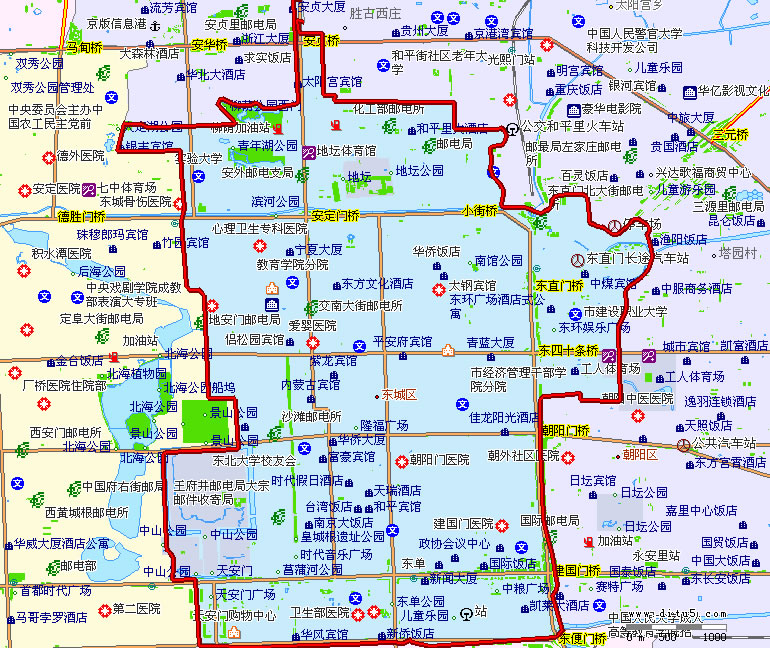 東直門(mén)街道 面積2.2平方千米,人口46017,政府駐工人體育館社區(qū)新中街66號(hào),下轄10個(gè)社區(qū)