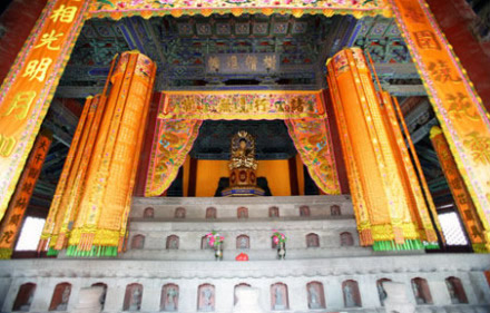 大雄寶殿:在天王殿后面,坐落在近兩米高的月臺上。門額上高懸清乾隆帝手書“蓮界香林”雕龍橫匾。原來還掛有清康熙帝所題“般若無照” 匾額和“禪心似鏡留明月,松韻如莫振舞風”的楹聯(lián),今已不存。殿內(nèi)屋頂上有三個木雕藻井,上圓下方,井內(nèi)各雕有一條團龍。下方漢白玉石雕的須彌座上供有明代鑄造的銅質(zhì)橫三世佛。正中為釋迦牟尼佛,南側(cè)為阿彌陀佛。北側(cè)為藥師佛。每尊佛像高3.2米,重5000公斤。大殿前左右兩側(cè)各有三間配殿,左側(cè)為伽藍殿,右側(cè)為祖師殿。