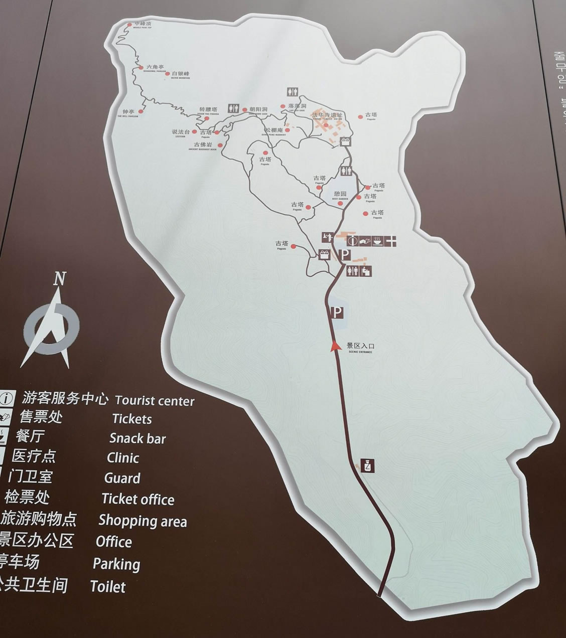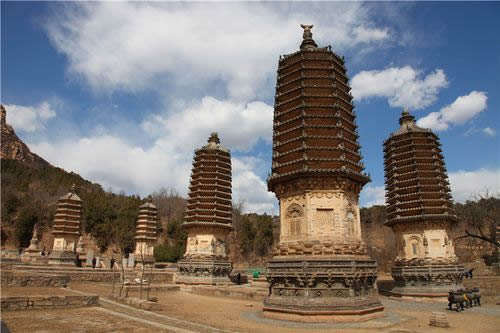 無銘覆缽密檐式塔位于法華禪寺址西南。總高8.8米。塔平面為六角形。基座、塔身略同前述各塔,但基座束腰處雕有金剛力士像則又不同前述各塔。塔身以上部位有檐三層,均作冰盤檐式,頂作疊澀式。再上依次為覆缽體、塔剎座和相輪,F(xiàn)存塔剎相輪以下部分。