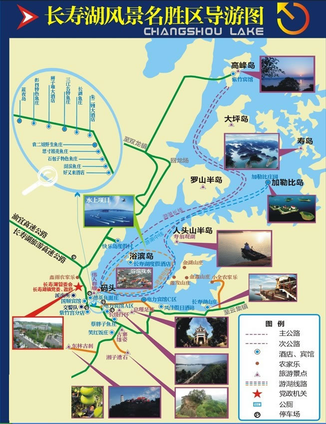 長壽湖是西南地區(qū)最大的人工湖,因1954年修建中國第一座自行設(shè)計(jì)、施工建設(shè)的大型水電工程獅子灘水力發(fā)電站形成湖泊。以長壽湖為核心,總面積266.73平方千米,其中湖面面積65.5平方千米,共有大小島嶼203個(gè),是三峽國際旅游黃金線的重要節(jié)點(diǎn)。最奇特的景觀是在湖心區(qū)域有一處由19個(gè)島嶼、半島圍合形成的長1299米、寬699米、占地33公頃的“天賜壽島”,其形狀似魏碑體的“壽”字。整個(gè)景區(qū)以其“島湖風(fēng)光”“長壽文化”享譽(yù)四方,并以“長湖浪嶼”被評(píng)為巴渝新十二景之一。