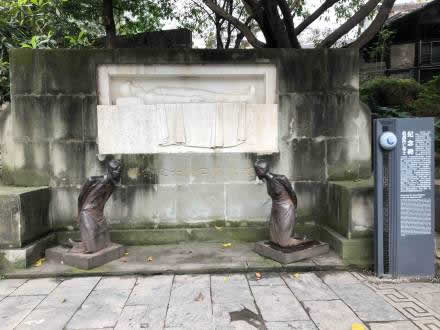 為紀(jì)念抗戰(zhàn)陣亡的將士而塑的大賣國賊汪精衛(wèi)、陳璧君夫婦的跪像。民國二十九年(1940年),跪像由馮玉祥主持、王臨乙設(shè)計創(chuàng)作,因經(jīng)費原因,原跪像為青石雕刻,20世紀(jì)50年代修公路被深埋地下,F(xiàn)跪像為生鐵鑄造,系2002年重新制作。