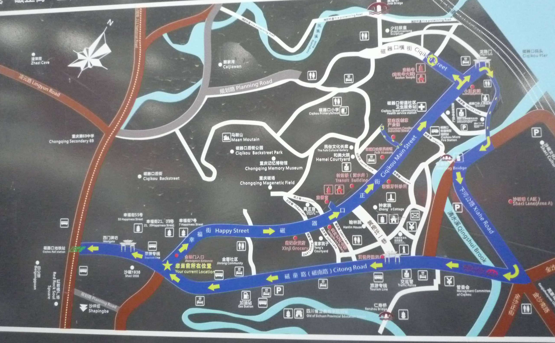 磁器口古鎮(zhèn),原名龍隱鎮(zhèn),位于重慶市沙坪壩區(qū)磁南街1號,沙坪壩區(qū)東北部嘉陵江畔。北距沙坪壩中心5千米,重慶市中心14千米,南距石井坡3千米。磁器口古鎮(zhèn)總面積32.5萬平方米,其中保存完好的古鎮(zhèn)核心區(qū)14.3萬平方米,分布于馬鞍山東側(cè)和東南側(cè)。古鎮(zhèn)依山而建,由山起城。以磁器口正街和橫街為骨架,42條巷道垂直于正街和橫街向馬鞍山脊和溪溝邊緣呈枝狀發(fā)展,形成特征明顯的樹枝狀平面格局。正街和橫街寬3—6.5米,將嘉陵江水運碼頭、寶輪寺及外圍交通干道聯(lián)為一體。巷道寬1.5—4.5米,順應(yīng)地形靈活布局,不拘一格,街道—巷道—宅院構(gòu)成公共空間、半公共空間、私有空間的3級空間結(jié)構(gòu),形成清晰的街區(qū)社會組織的基本模式。