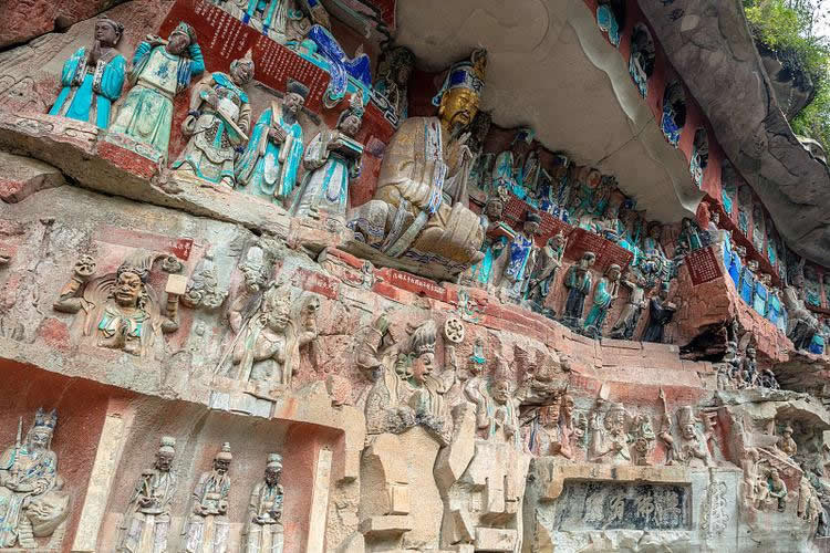 大足石刻開鑿于唐永徽元年(公元650年),盛于宋代,F(xiàn)存摩崖石刻造像5萬余尊,銘文10萬余寧,遍布100多處。其中比較重要的有北山(包括北塔)、寶頂山、南山、石門、石篆山石刻,是大足石刻中規(guī)模最大藝術(shù)價值最高的石刻造像代表。