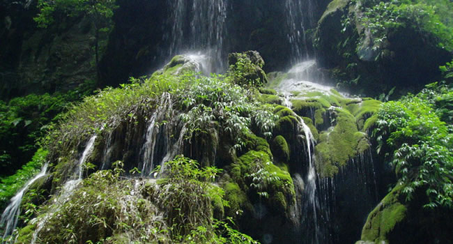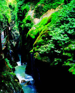 大大小小的泉水順著苔鮮爭(zhēng)相跳躍而下,在陽(yáng)光的投射下熠熠生輝,讓你想起古人所云:“大珠小珠落玉盤!比嗽趰{中走,水在峽中飛,時(shí)隱時(shí)現(xiàn)的陽(yáng)光,飛泉流瀑濺起的水霧,奇形怪狀的石乳形成一片如夢(mèng)如幻的世界,這浪漫之旅,讓人留連忘返,不忍離去。