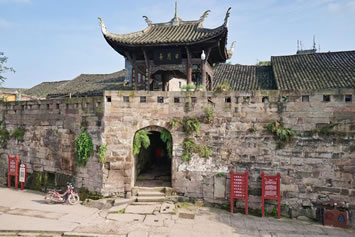 日月門(mén):系大榮寨的四大城門(mén)之北門(mén),門(mén)樓上有日月亭,門(mén)內(nèi)即煙雨巷,“橋橫古渡煙霞聚,寨聳雄關(guān)日月巡”。門(mén)內(nèi)有一甕形古井,深12.2米,內(nèi)設(shè)暗道通往河心,由重一噸多的石板遮蓋。該井系嘉慶年間修建的戰(zhàn)備設(shè)施,以備遭兵匪長(zhǎng)期圍困時(shí)取水傳信之用。