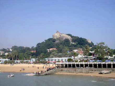 俗稱“巖仔山”,別名“晃巖”,相傳鄭成功來(lái)到晃巖,看到這里的景色勝過(guò)日本的日光山,便把“晃”字拆開(kāi),稱之為“日光巖”。日光巖游覽區(qū)由日光巖和琴園兩個(gè)部分組成。日光巖聳峙于鼓浪嶼中部偏南,是由兩塊巨石一豎一橫相倚而立,成為龍頭山的頂峰,海拔92.7米,為鼓浪嶼最高峰。日光巖寺,俗稱“一片瓦”,實(shí)際是一個(gè)天然石洞,以一巨石為頂,后依山形地勢(shì)建起寺廟的,具體時(shí)間是明朝正德年間萬(wàn)歷十四年。日光巖寺屢毀屢建,清同治年間,建圓明殿,祀彌勒,并在廟前建一八角亭,上掛“日光寺”匾。解放后,圓明殿改為念佛堂,大雄寶殿是民國(guó)十六年(1917年)年建的。