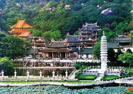 南普陀寺,位于廈門市思明區(qū),始建于唐末五代,初稱泗洲院。北宋僧文翠改建稱無盡巖。元廢。明初復(fù)建,更名普照寺。明末詩僧覺光和尚遷建于山前,殿堂院舍齊備,住僧常達(dá)百余眾,清初又廢于兵禍。清康熙二十二年(1684年),靖海候施瑯收復(fù)臺(tái)灣后駐鎮(zhèn)廈門,捐資修復(fù)寺院舊觀,又增建大悲閣奉觀音菩薩,并以之與浙江普陀山觀音道場相類比,更名為南普陀寺,此后數(shù)百年來,經(jīng)歷代主持景峰、省己、喜參諸和尚多次重修擴(kuò)建,至民國初年,已構(gòu)成三殿七堂俱全的禪寺格局。