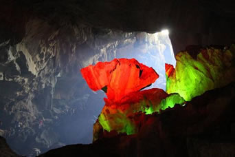 自藏禾洞沿石階而上,便到了雷公洞。洞內(nèi)石筍和石鐘乳十分發(fā)達(dá),因巖石含有碳酸鈣、鐵質(zhì)、方解石、石英等成分,整個(gè)洞廳色彩斑斕。洞底暗河水聲隆隆,猶如雷鳴,故而得名。傳說天上雷神每年都要下來巡洞一次,在這里休息。