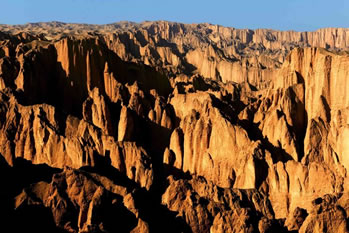 石林則依著黃河的彎轉(zhuǎn),藐著黃河的水流,這個(gè)場(chǎng)面保持著一種驚心動(dòng)魄的興奮,一看就是飛逝而去的千萬年啊,千萬年。老龍灣像一條長長的、波光粼粼的跑道,黃河拍打著細(xì)浪,從聳立的石林中,陡峭的巖石旁流過去,固執(zhí)地向干涸遙遠(yuǎn)的北方挺進(jìn)。風(fēng)吹過,水涮過,千萬年的歲月,靈動(dòng)和冥想,一路歌舞狂歡。突然一剎那就是永恒。停在那里回轉(zhuǎn)的頭型,飄飛的發(fā)絲,閃逸的裙裾一下子被動(dòng)結(jié)了,面目間的笑意還沒有來及抹去。假如有一天,您也來到石林,是否會(huì)為這一片晴朗而遼闊的天空下毫無造作、天然凝就的靈魂而感動(dòng)和震撼?大自然的神筆飛揚(yáng),你縱然放開想象,馳騁神思。望尖銳或圓錐狀的山峰,基部相連的簇狀,是石林發(fā)育地貌形態(tài)。只要能夠聯(lián)想到的物象,毫無例外活生生矗立在你的眼前,仰觀景慕,活靈神現(xiàn);你沒有想到的也一幕幕向你襲來,目不暇接。山峰如聚,峰嶺沸騰了一般,黃河石林以它非石非巖的特質(zhì),在這塊土地上托起一個(gè)立體的神話。雅丹、丹霞、峰林為一體的地貌奇觀寫意了恢弘的場(chǎng)景,刀鋒擁擠,千軍涌動(dòng),萬馬奔騰,這儼如一個(gè)拼殺的戰(zhàn)場(chǎng),風(fēng)行走其間鼓動(dòng)著金屬碰撞的鏗鏘,它不再是一個(gè)夸張的舞臺(tái),場(chǎng)面不再是一個(gè)宏大的舞池。穿越石林,我們不自主地感知黃土高原的陽剛的軀身,緘默的神態(tài),堅(jiān)毅的面容,它在風(fēng)雨中矗立,日復(fù)一日,從不愿放棄對(duì)大地的眷戀,對(duì)太陽的向往。