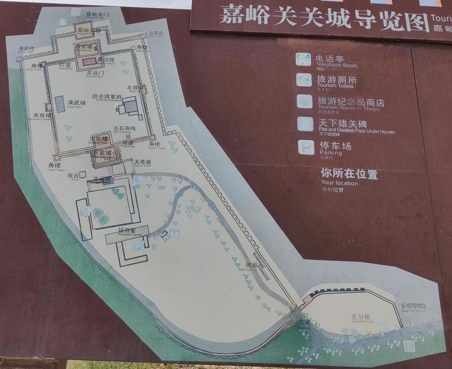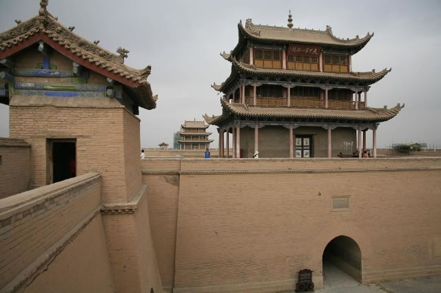 關城以內城為主,周長640米,面積2.5萬平方米,城高10.7米,以黃土夯筑而成,西側以磚包墻,雄偉堅固。內城開東西兩門,東為“光化門”,西為“柔遠門”,意為以懷柔而致遠,安定西陲。門臺上建有三層歇山頂式建筑。東西門各有一甕城圍護,西門外有一羅城,與外城南北墻相連,有“嘉峪關”門通往關外,上建嘉峪關樓。