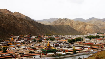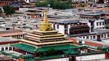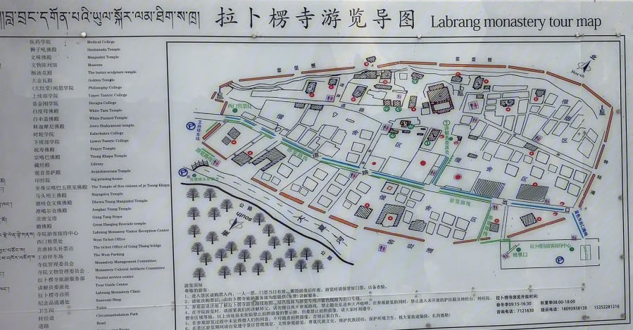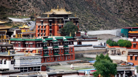 寺院坐北向南,占地總面積86.6萬平方米,建筑面積40余萬平方米,主要殿宇90多座,包括六大學(xué)院、16處佛殿、18處昂欠(大活佛宮邸)、僧舍及講經(jīng)壇、法苑、印經(jīng)院、佛塔等,形成了一組具有藏族特色的宏偉建筑群,房屋不下萬間。