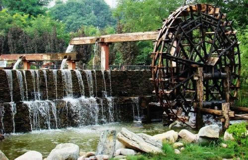水車歷史悠久,外形奇特,起源于明朝,是蘭州市古代黃河沿岸最古老的提灌工具。蘭州水車,又叫“天車”、“翻車”、“灌車”、“老虎車”,園內(nèi)由雙輪水車、圍堰、水磨坊服務(wù)室和游樂區(qū)組成,立于黃河南岸,旺水季利用自然水流助推轉(zhuǎn)動(dòng);枯水季則以圍堰分流聚水,通過堰間小渠,河水自流助推。當(dāng)水流自然沖動(dòng)車輪葉板時(shí),推動(dòng)水車轉(zhuǎn)動(dòng),水斗便舀滿河水,等轉(zhuǎn)至頂空后再傾入木槽,源源不斷,流入園地,以利灌溉。水車園再現(xiàn)了水車這種古老的水利機(jī)械,可以使中外游人一睹為快。