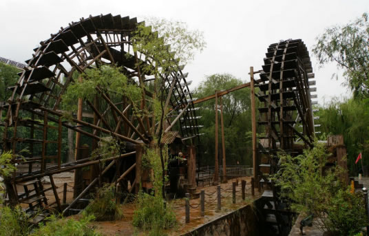 在水車廣場展現(xiàn)著各具特色的水車:在我們左側(cè)的是一架推水車(又稱水掛子),它依靠人力推動(dòng)水車,將水提起,傾人水渠,灌溉農(nóng)田;在我們右側(cè)的是一架腳踏水車,其原理是用力踩動(dòng)木輪,由傳動(dòng)鏈條帶動(dòng)水車,達(dá)到提水灌溉的目的;
