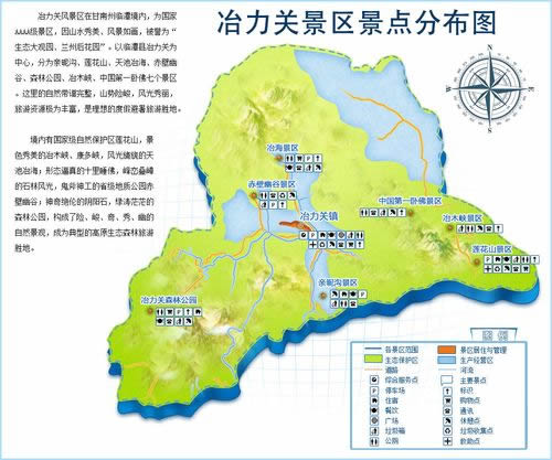 冶力關(guān)風(fēng)景區(qū)在臨潭縣境內(nèi),以臨潭縣冶力關(guān)為中心,分為蓮山、西峽、東峽和冶海湖四個(gè)景區(qū)。主要景觀有蓮花山、冶木峽、冶海湖、赤壁幽谷、巨型臥佛、黃捻子、香子溝等景觀。