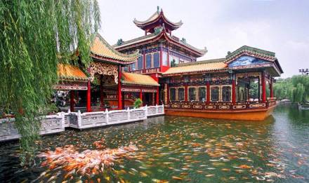 正門的白石仿古牌坊,雄偉巍峨,巧奪天工。園中的陶塑、瓷塑、磚雕、灰塑、石刻、木雕等藝術(shù)精品琳瑯滿目。驚世之作,當(dāng)數(shù)已列入大世界吉尼斯之最的瓷塑浮雕《清明上河圖》和巨幅磚雕《吐艷和鳴壁》。荔島中的聚家閣金碧輝煌,雍容華麗,閣內(nèi)供奉著萬世師表孔子銅像,供游人瞻仰。