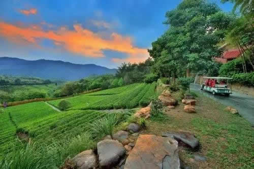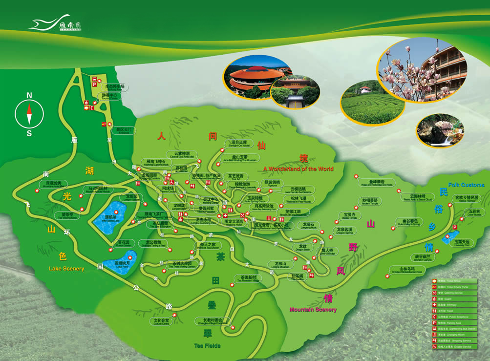 主要景點(diǎn)和設(shè)施有茶田、果園、望茶亭、茶情閣、茶藝館、美食街、生態(tài)谷、游泳池、網(wǎng)球場、人工湖、山水瀑布、游客中心、會議中心、圍龍食府、山莊別墅、圍龍大酒店、茶花大觀園等。