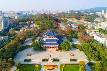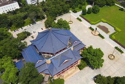 從空中俯視,紀念堂呈外突的傘型結構,青磚藍瓦藍象征著孫中山先生當年。