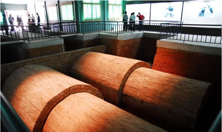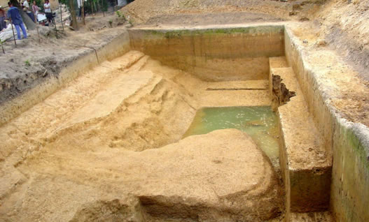 草鞋村遺址位于北海市合浦縣廉州鎮(zhèn)草鞋村,西臨南流江分支—廉州西門(mén)江。發(fā)現(xiàn)陶窯、磚窯共22座,建筑遺址5處,水井5口及一批作坊遺跡,呈環(huán)狀分布于遺址臺(tái)地的坡坎四周,初步判定為漢代嶺南地區(qū)重要的官營(yíng)手工業(yè)作坊。