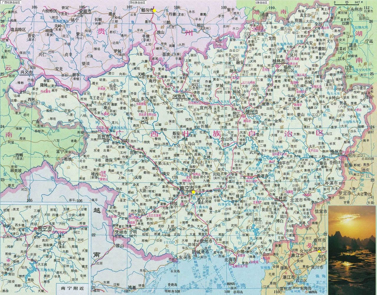 廣西河流眾多,清澈娟秀,在地域上多與奇峰相配,形成一派山環(huán)水繞,山水相依的秀麗景色。除舉世聞名的漓江外,景色優(yōu)美的還有融水的貝江、資源的資江、宜山的下規(guī)河、大新的黑水河、崇左的左江、寧明的明江等。湖泊風(fēng)景多以較大的湖泊或水面為主景,湖岸的山丘、原野和農(nóng)家村舍、田園風(fēng)光或城市風(fēng)貌等為襯景而組成。如桂林的榕湖、杉湖,南寧的南湖,柳州的龍?zhí),貴港的東湖,陸川的龍珠湖等。此外,廣西還有不少水質(zhì)優(yōu)良、水面寬闊、群山環(huán)抱、湖光山色十分秀美的水庫,如靈川青獅潭、百色澄碧河、富川龜石、邕寧大王灘、合浦洪湖江、玉林寒山等水庫。