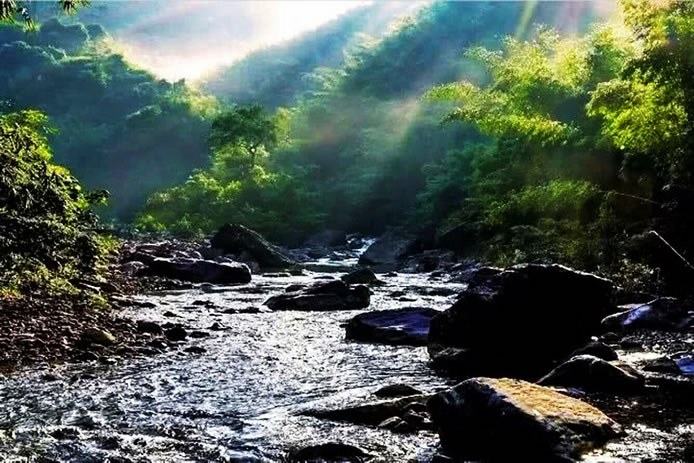 龍?zhí)渡止珗@,內(nèi)群山連綿、峰巒疊嶂、千峰如屏、劈地摩天、怪石林立、神奇峻秀。連綿的群山猶如上下飛舞的綠龍。山的脈絡(luò)主次分明,層次豐富。遠眺群山前擁后簇,高矮參差,綿綿不斷地伸展開去。最高峰大平山頂海拔1158米,相對高度780米,四周眾山簇擁,呈現(xiàn)出一派頂天立地的雄偉氣勢。