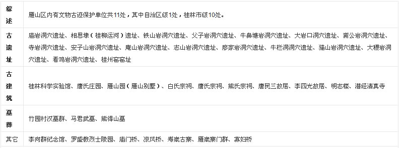 雁山區(qū)境內(nèi)風(fēng)景名勝有漓江、相思江、冠巖、父子巖等山水自然風(fēng)貌;有雁山公園、唐氏莊園、相思埭遺址、廟巖洞穴遺址、桂州窯窯址、竹園漢墓群、馬君武墓、羅盛教烈士陵園等自治區(qū)、市文物保護(hù)單位;有壽崴古寨、雁咸古寨門、潛經(jīng)白氏宗祠、潛經(jīng)清真寺、竹園廟門橋等古寨古建筑;有冠巖景區(qū)、愚自樂園、雁山植物園、神龍谷、蛇王李莊園、龍門古榕等生態(tài)園林人文融合景觀。其中漓江雁山段是桂林漓江景區(qū)5A級(jí)景區(qū)的一部分;桂林冠巖景區(qū)、愚自樂園是4A級(jí)景區(qū);神龍水世界景區(qū)、多耶古寨——蛇王李景區(qū)是3A級(jí)景區(qū)。