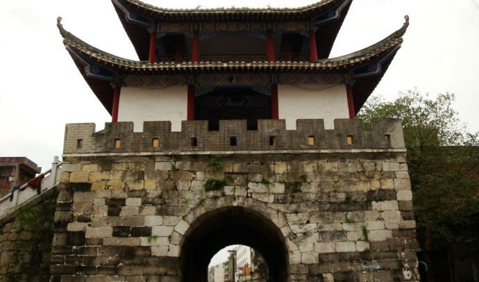 四牌樓,位于宜州區(qū)一中東側,建于乾隆二十五年,時稱“會魁樓”,又稱“四牌樓”。此樓位于十字路口,形成東西南北四個門洞,內外相通。四牌樓樓高三層,一樓全用大型細鑿條石砌成,呈四方形,工藝精巧。邊長11.5米,四面拱門各高3.9米,寬3.5米。二三樓為木質結構的重檐樓閣,紅漆圓柱,飛彩流丹,古樸莊重。“文革”中二三樓被拆毀,只存有一樓拱洞石門,樓上建筑及額匾碑刻已不復存在。