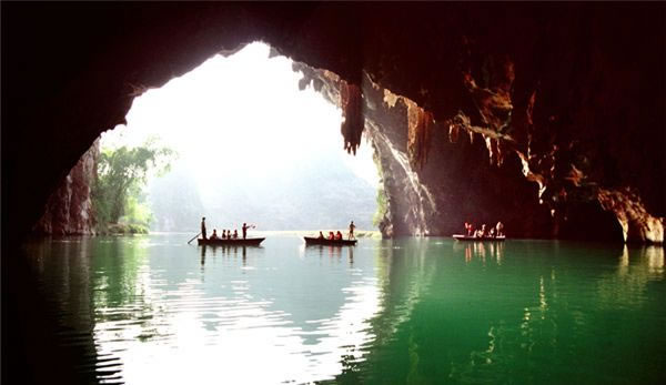 百鳥巖位于甲篆鄉(xiāng)烈屯西北面的漠齋山下,別名龍虎洞。因洞內(nèi)燕子棲集,蝙蝠掠飛,又名百鳥洞。盤陽河自吉屯白熊洞潛入山下,形成1000多米的伏流暗河后,在此洞流出。洞口寬50米,一石壁把洞口分成兩個略呈三角形的左右洞口。左側洞口寬40米,高15米,兩洞口內(nèi)側相通。洞深500米,蜿蜒曲折,直通與白熊洞一山之隔的拉類坳下的一個側洞口。洞中水平如鏡,深不可測,寬處約40米,窄處10米,從洞口行舟至300米轉折處,距水面30米處有一圓形天窗,山坳之光照到水面,猶如舞臺上的光束,色彩紛呈,近右側洞口處有沙灘,可?恐鄞。沙灘右側是一塊30多平方米的石臺,臺面深溝淺窩,坑坑坎坎,石臺一側,洞壁雪白,可攀援其中。有石鷹、石柱、石幔、石觀音菩薩等,百態(tài)千姿,令人目不暇接。石臺的周圍有仙女梳妝、海螺石,石螺對面有石桌、石缸和石松果等。側面洞口外香椿林下野花艷目植被繁衍,把洞口點綴得幽靜雅致。洞中歧洞叉水道不可勝數(shù),密如蜂房,不知所向,整個洞仿佛一座裝飾華麗、景幻莫測的水下龍宮。其奇特的景象似桂林蘆笛巖,又因非乘舟不能游覽,游人贈予“水上蘆笛巖”的美譽。