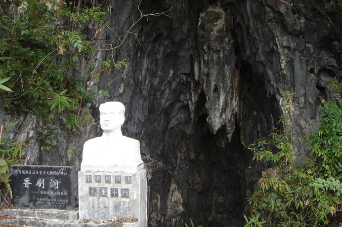 香刷洞位于西山鄉(xiāng)弄列村東北部的一座半山坡上,香刷洞為石灰?guī)r溶洞,洞口高5米,深10米,寬約6米,洞底型似臥底,洞中一年四季比較干燥,洞內(nèi)可容納20多人。洞內(nèi)右側一高處有一平臺,可以臥人,臺左側有一小洞穴可以匍伏出洞外。民國21年間(1932年)10月19日晚,堅持在右江斗爭的中國工農(nóng)紅軍獨立第三師師長韋拔群在戰(zhàn)略轉移中隱藏在此洞中,不幸被叛徒韋昂殺害,犧牲時僅38歲。香刷洞是巴馬瑤族自治縣縣級重點文物保護單位。