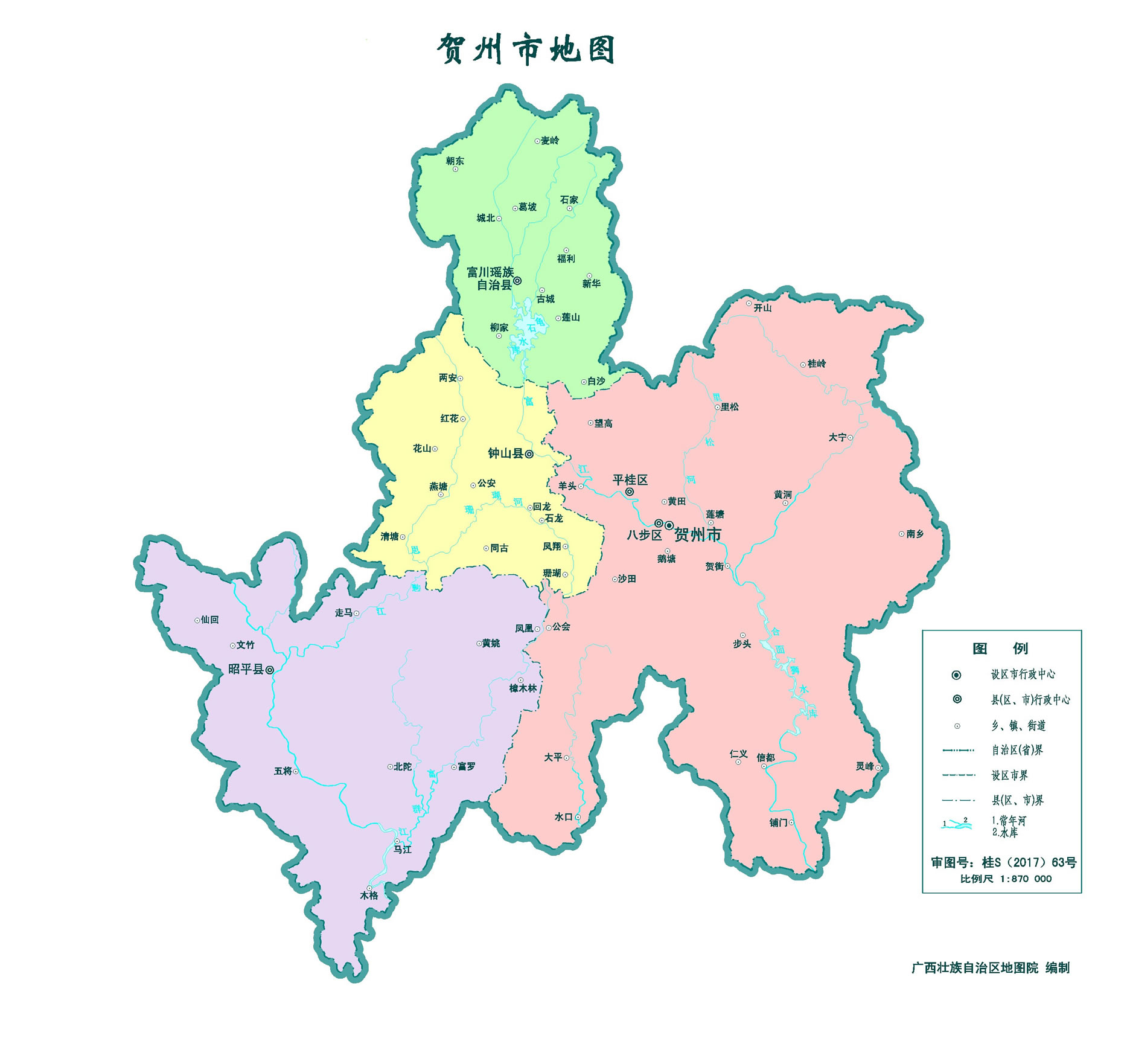 賀州市轄2個(gè)市轄區(qū)、2個(gè)縣、1個(gè)自治縣: