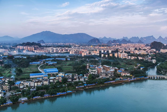 地形地貌 富川瑤族自治縣位于桂東北山區(qū),四面環(huán)山,中間低落,略呈橢圓形盆地,地勢北高南低。西部及東南部分布著橫亙連綿的山脈,谷深坡陡,地勢高峻;東部為石灰?guī)r溶蝕而成的巖溶峰林地貌,群峰拔挺;東北面為丘陵地貌,頂圓坡緩,波狀起伏;中部為寬坦的溶蝕平原地區(qū),地勢低陲,孤峰獨(dú)山拔地而起。