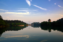 靈湖是一個(gè)自然湖泊,素有小西湖之美譽(yù),湖面寬780畝,其最深的地方可達(dá)30米。其水來(lái)自廣西靈川縣海洋鄉(xiāng)的海洋河。水質(zhì)清澈冰涼,四周青松翠柏倒影湖中,猶如一幅淡淡的山水潑墨畫(huà)!八鉃囦偾绶胶,山色空蒙雨亦奇”