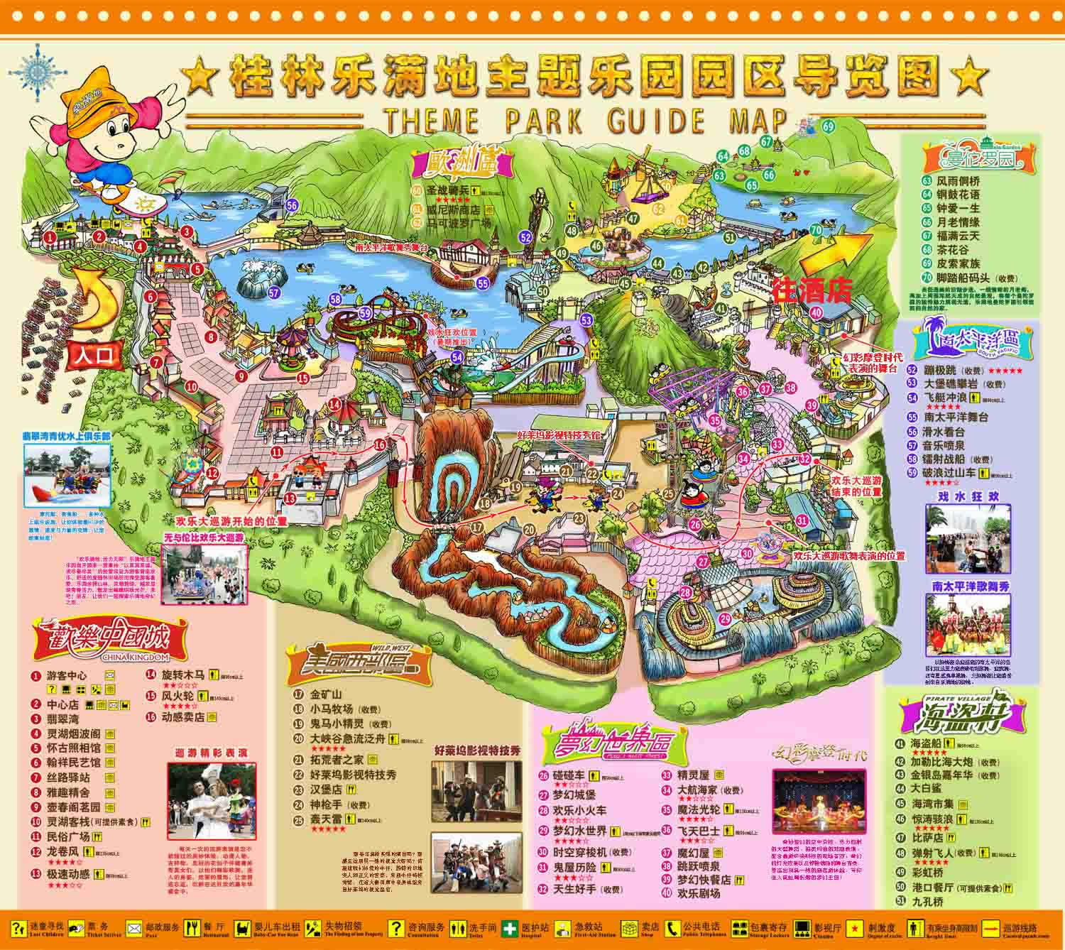 途中景點(diǎn):正門 > 美國(guó)西部區(qū) > 夢(mèng)幻世界區(qū) > 海盜村 > 南太平洋區(qū) > 歐洲區(qū) > 曼陀羅園