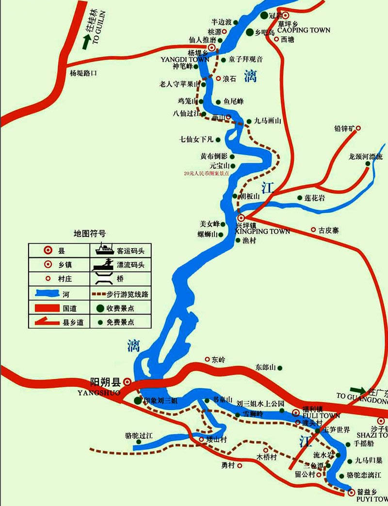 興坪鎮(zhèn)位于廣西壯族自治區(qū)桂林市陽(yáng)朔縣縣城東北部,漓江上游兩岸,距縣城25公里。漓江流經(jīng)興坪,形成“S”字形河灣,是漓江風(fēng)光的薈萃之地。葉劍英元帥《由桂林舟游陽(yáng)朔》詩(shī)道:“春風(fēng)漓水客舟輕,夾岸奇峰列送迎。馬躍華山人睇鏡,果然佳勝在光坪”。山水相依,景點(diǎn)密集,兼有奇、險(xiǎn)、秀、美、趣的特點(diǎn)。