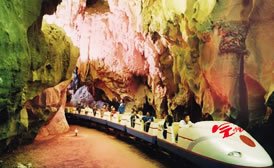 冠巖位于桂林市南29公里處,漓江東岸的草坪鄉(xiāng),因山形如帝王的紫金冠而得名。冠巖是一個(gè)巨型地下河溶洞,全長(zhǎng)12公里,發(fā)源于桂林東面的海洋山。冠巖1995年正式對(duì)外開(kāi)放,群峰競(jìng)秀,碧水傳情,洞奇石美。 夜幕降臨,還有美妙的民族歌舞晚會(huì),熱情的山歌響徹峽谷。