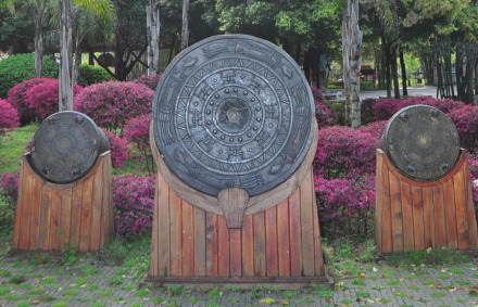 鑄銅鼓要先祭神,有時(shí)甚至用人祭。古代,銅鼓多用于祭神、節(jié)日喜慶,打仗時(shí),則是號(hào)令士兵的指揮工具。全球現(xiàn)有古銅鼓1600多個(gè),中國(guó)有1400多個(gè),其中廣西出土的獨(dú)占500多個(gè)。廣西博物館現(xiàn)藏有世界最大的銅鼓,鼓面直徑165厘米,鼓高67.5厘米,重約300公斤,被稱為“銅鼓王”。