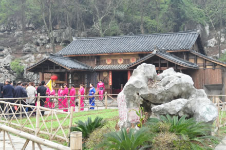 “如今廣西成歌海,都是三姐親口傳”。劉三姐是傳說(shuō)中的壯族歌仙,她以山歌為武器,與土豪莫懷仁進(jìn)行了針?shù)h相對(duì)的斗爭(zhēng)。景區(qū)內(nèi)的豪宅就是莫懷仁居住的莫府。莫府坐北朝南,東青龍,左傍蒼翠秀美的西山;西白虎,右依靈氣生生的踩月山;南朱雀,前環(huán)美麗的桃花江;北玄武,背靠徐霞客記載過(guò)的獅子峰。