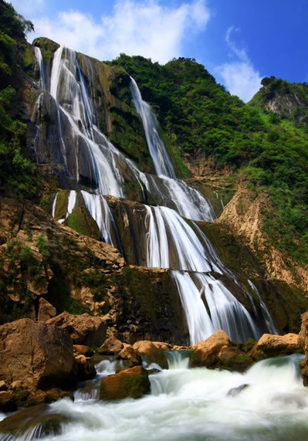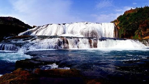 “遙聞水聲轟轟,從隴隙北望,忽有水自東北山腋瀉崖而下,搗入重淵,但見其上橫白闊數(shù)丈,翻空涌雪,而不見其下截,蓋為對崖所隔也!边@是徐霞客在《徐霞客游記》中對陡坡塘瀑布的描述。陡坡塘瀑布因1985年曾在該瀑布拍攝電視連續(xù)劇《西游記》序曲《敢問路在何方》中,唐僧師徒四人牽馬過河的場景而聲名遠(yuǎn)播。