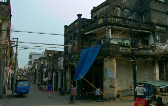 據史書記載,定安古城從籌建到1519年竣工共費時13年。城圍長近千米,高四米多,寬五米多,開有東、南、西城門,各建有城樓。北門是1545年才開的,后來因不堪倭寇的騷擾,曾經堵上過,直到1690年才又重開。古城的城墻在建國初期就已經被拆毀了,城門這一塊大概是因為看它結實牢固,便利用來建了樓房,因此還被保存下來。城門洞里放著兩只卸了龍頭的龍舟,已經很舊,架在木樁子上。地是用青石板鋪設的,經過幾百年人來人往,石板被磨得很薄。門洞里的墻面上也是一塊塊青石磚砌的,摸上去很干爽,一點也沒有陳年的霉味。