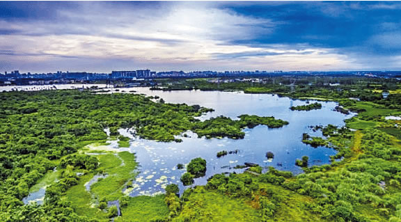 海口五源河國家濕地公園,南起永莊水庫,北至五源河河口海域,主要包括永莊水庫、五源河及河口海域3個(gè)濕地單元,規(guī)劃面積1300公頃(1.95萬畝),其中濕地面積958公頃(1.44萬畝),有4個(gè)濕地類及10個(gè)濕地型,濕地率為73.69%。公園內(nèi)共有野生維管束植物96科318屬427種,其中水蕨為國家二級(jí)保護(hù)植物。共有野生脊椎動(dòng)物25目66科154種,其中國家Ⅱ級(jí)重點(diǎn)保護(hù)野生動(dòng)物多達(dá)11種。五源河上游的永莊水庫及周邊大面積的火山熔巖濕地和灌叢沼澤區(qū),是?谑袇^(qū)內(nèi)自然生態(tài)保存較為完好的區(qū)域,擁有城市內(nèi)稀缺的動(dòng)物棲息地和植被生態(tài)環(huán)境。