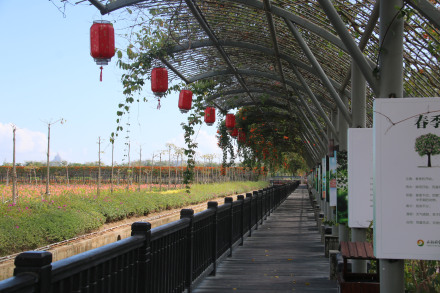 五色長(zhǎng)廊長(zhǎng)達(dá)200米,利用原生態(tài)爬藤類植物打造而成,炮仗花、使君子、百香果長(zhǎng)年環(huán)繞于長(zhǎng)廊頂,四季花開(kāi)、碩果累累、香飄四溢,長(zhǎng)廊腳基處龍船花爭(zhēng)先斗艷,形成了一座天然文化欣賞景觀。