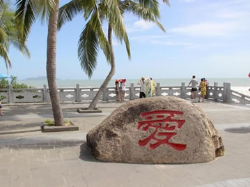 景點(diǎn)位于廣場(chǎng)的左右側(cè),在此矗立著兩塊石刻,左側(cè)的“愛(ài)”字,右側(cè)是“情定天涯海角,相愛(ài)白頭到老”。這愛(ài)情石刻圍繞著廣場(chǎng)中央的天涯海角星,與海面上的心形 “愛(ài)情石”遙相呼應(yīng)。