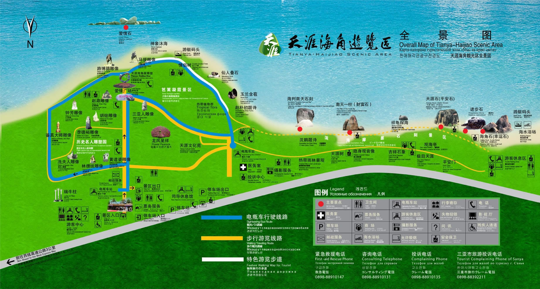 2、步行游覽線路:從大門(mén)口環(huán)繞歷史名人雕塑園游覽一圈,然后沿著海濱特色游覽步道行走,游覽笆籬凝霞景區(qū),欣賞熱帶植物群,繼續(xù)沿著步道走,游覽熱帶雨林景觀、天涯樹(shù)、隱身觀音像,到海邊觀看摩崖石刻群,然后原路返回,在電瓶車重點(diǎn)站處走天涯路步道,參觀天涯文化苑,然后經(jīng)三亞人雕像到愛(ài)情廣場(chǎng),沿主干道到景區(qū)出口。 |